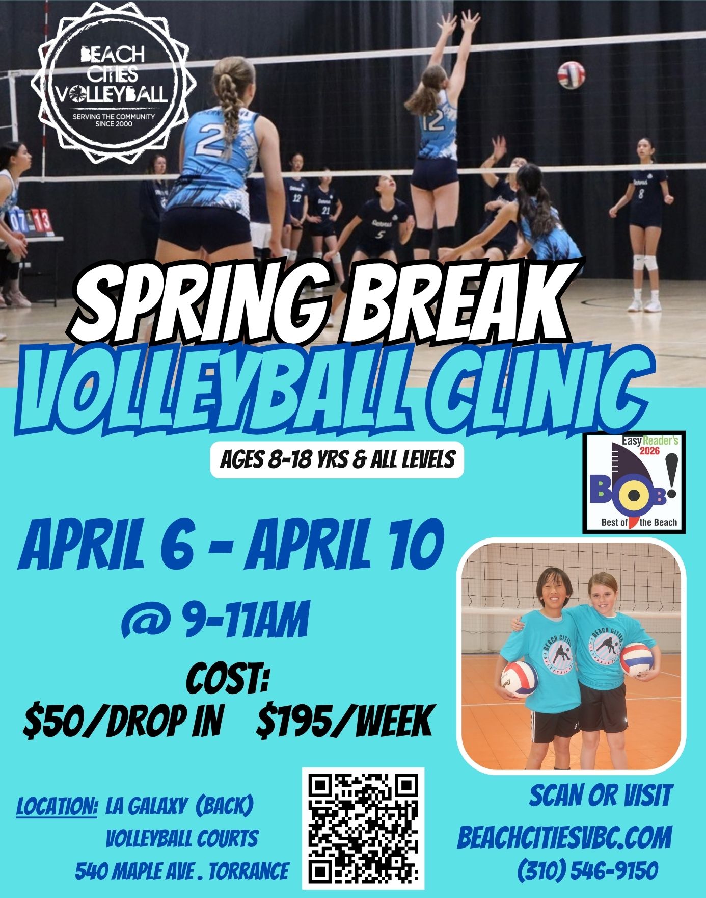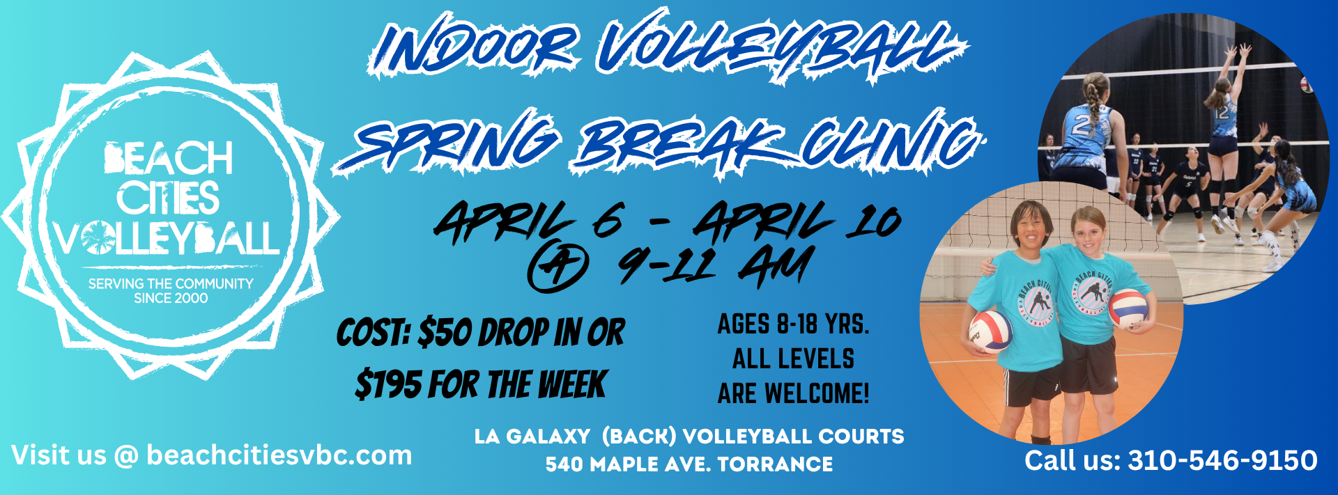 Each session, no matter the location is 6 weeks long. Held one day per week at our PV location and 1-2 days per week at our Torrance location. Beginning players with little or no previous experience can attend either location. Emphasis will be on skill development and how these skills contribute to playing volleyball well. Also, emphasized will be the importance of working within a team structure. Periodically, there will be competitions made up of teams of players from within the group.